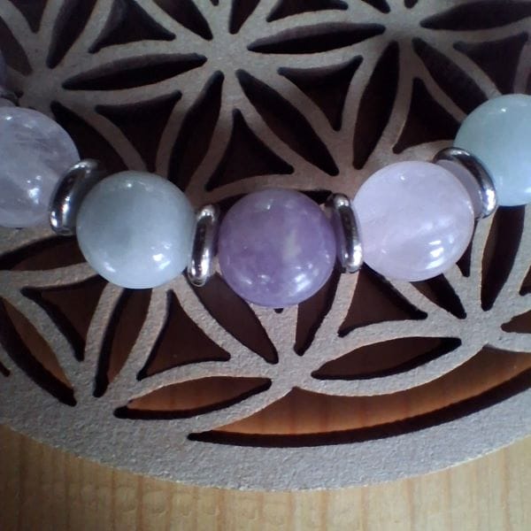 - Lépidolite (violette) : pierre de la paix intérieure, elle aide à calmer le stress et favorise l’équilibre émotionnel.