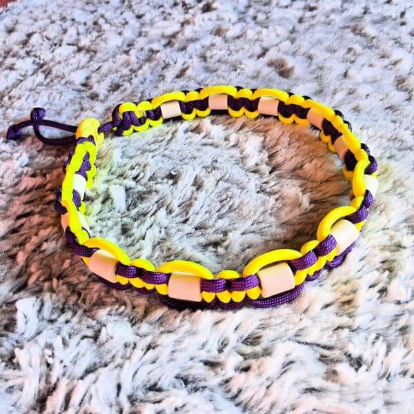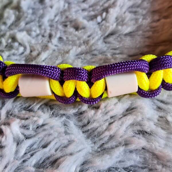 - Tressage en Paracorde 550 (diamètre 4 mm) pour les colliers à partir de 35 cm et en Paracorde 425 (diamètre 3 mm, couleur : noir) pour les plus petits.